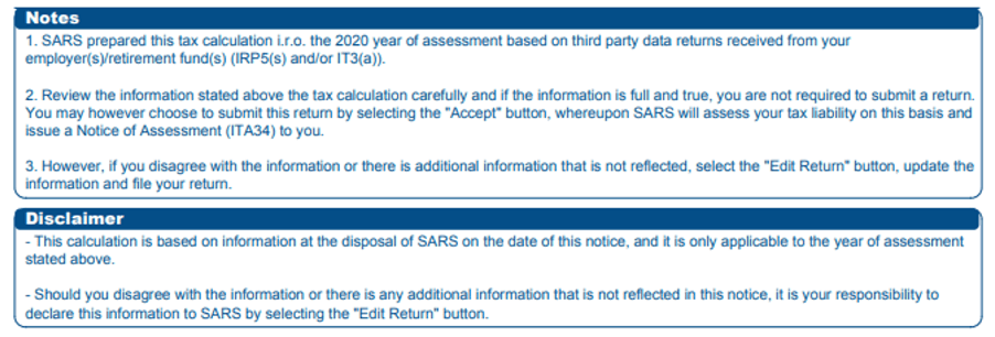 Tax Ref: ******[NNNN]. Your 2020 Year of Assessment tax calculated results is RXXX.XX, based on the information at SARS disposal. You can accept or edit your return through the SARS digital channels. Failure to do so may result in SARS raising an estimate assessment. For more info, visit the SARS website on www.sars.gov.za/TaxTypes/PIT/Tax-Season/Pages/How-does-the-Tax-Calculation-work.aspx